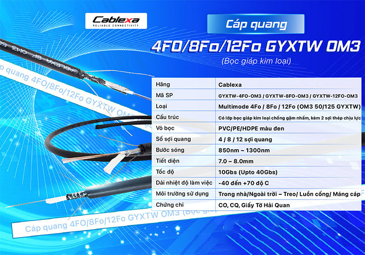 Thông số kỹ thuật cáp quang 8 sợi OM3 bọc giáp kim loại Cablexa