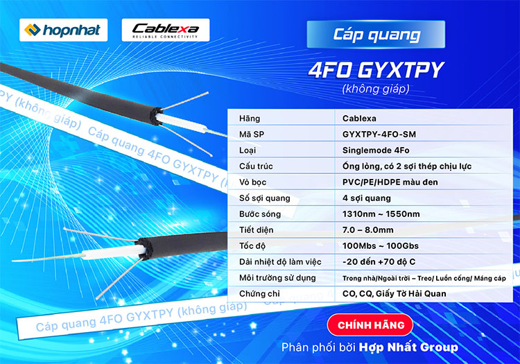 - Cáp có 4 sợi quang truyền dẫn nên có phương án dự phòng (backup), giúp dễ dàng xử lý và tiết kiệm chi phí trong trường hợp đứt gãy sợi quang.